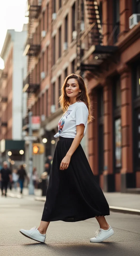 This outfit blends casual comfort with feminine shape. The graphic tee adds personality while the black midi skirt keeps it grounded and wearable.