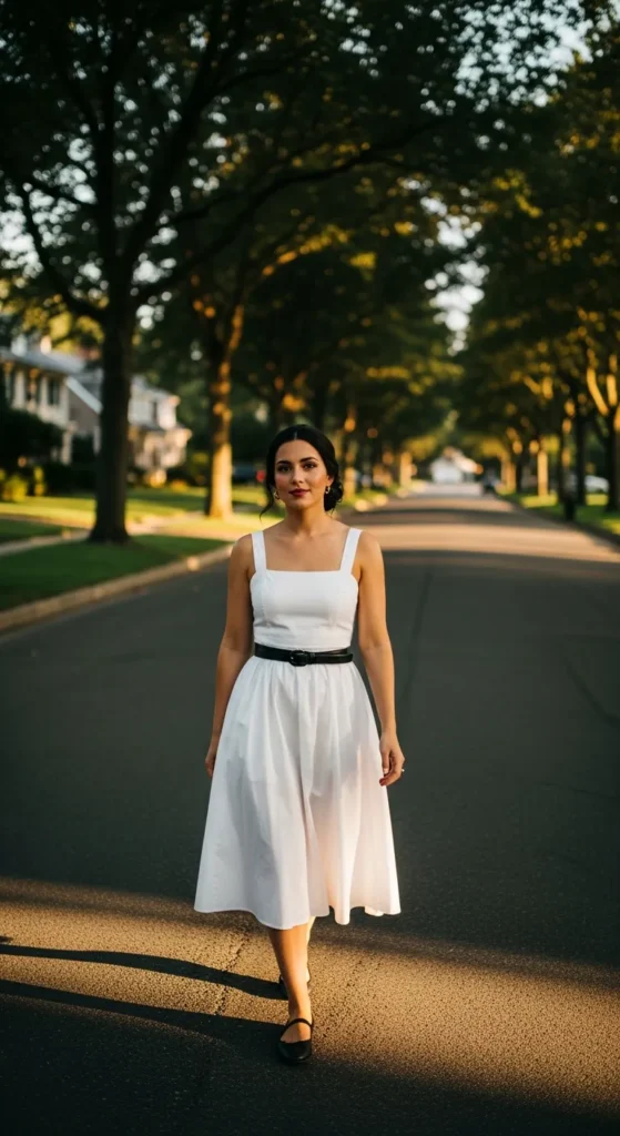 A breezy white sundress cinched with a black belt instantly creates shape while keeping the look light and summery. It feels fresh, feminine, and emotionally uplifting.