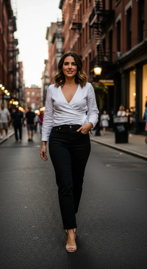 A white wrap top paired with black straight-leg jeans feels flattering and emotionally confident. It’s a look that feels put-together without being stiff.