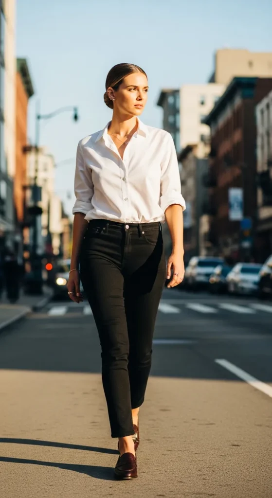 A crisp white button-down tucked into black jeans creates instant clarity. It’s clean, powerful, and timeless, giving that fresh-start feeling while staying wearable for both casual errands and low-key professional moments.