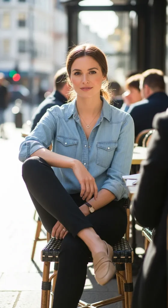 Black jeans paired with a light denim shirt offer subtle contrast without clashing. The look feels casual but crisp, perfect for days when you want something easy yet visually balanced.