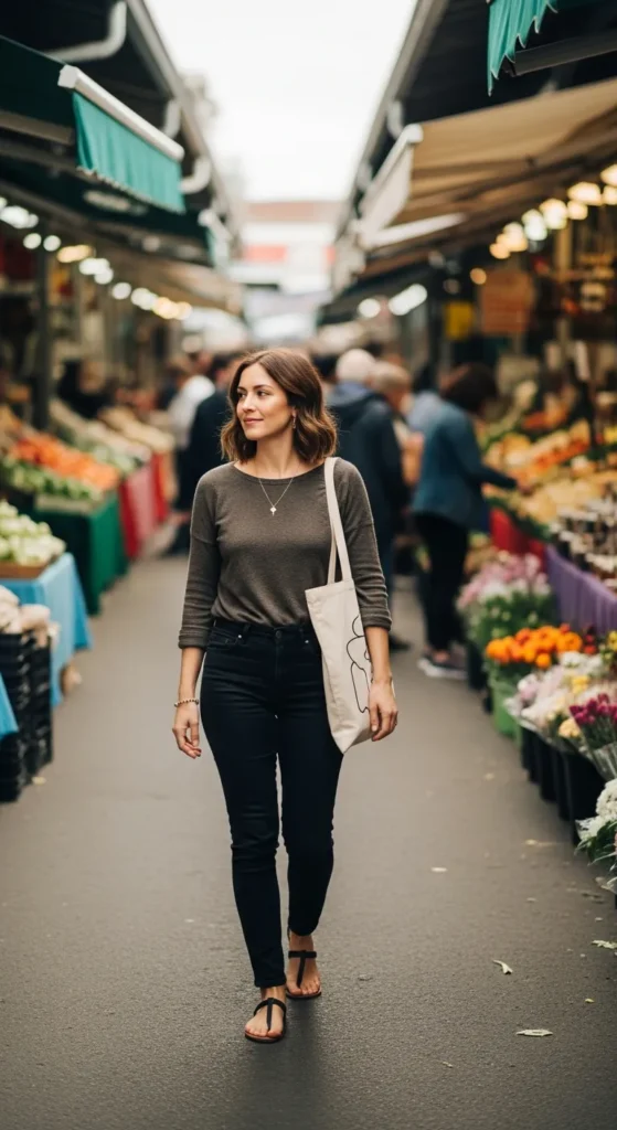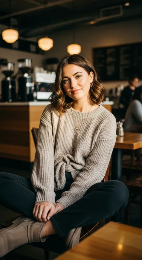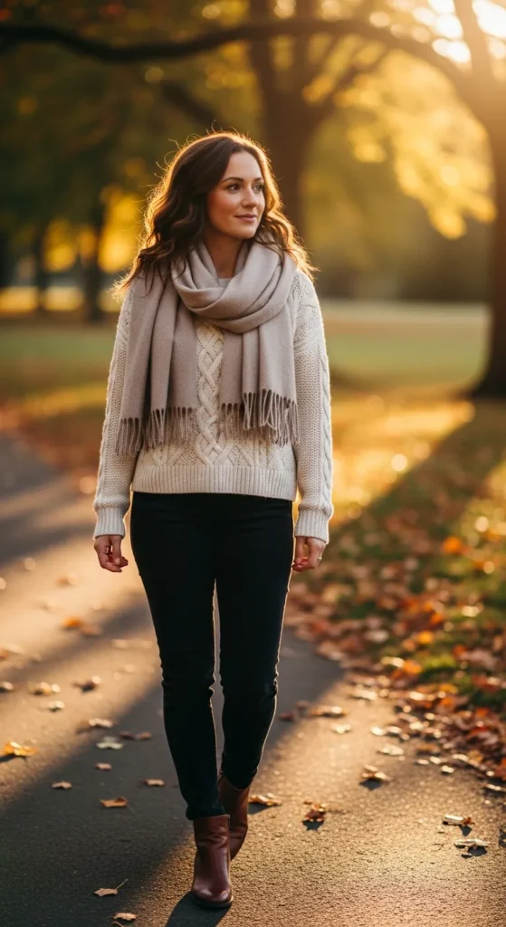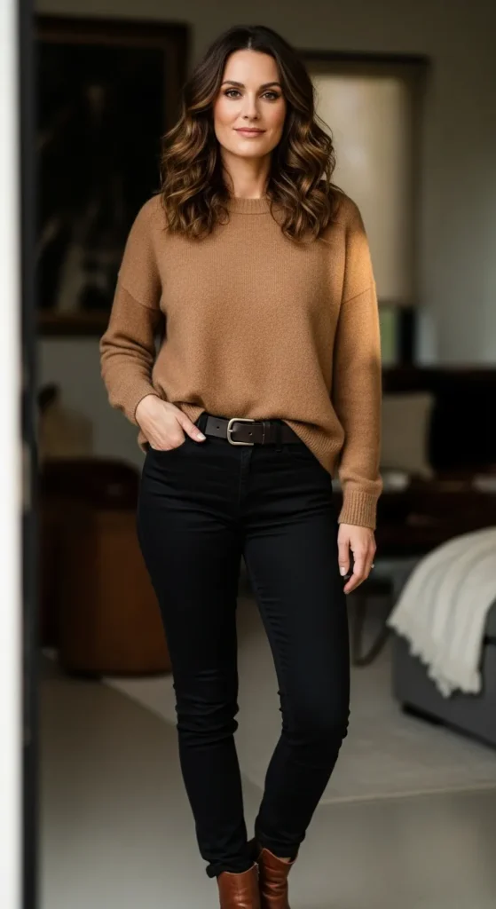 A slightly slouchy sweater paired with black jeans feels comforting and stylish at once. It’s that throw on and go outfit that still looks considered and flattering in everyday settings.