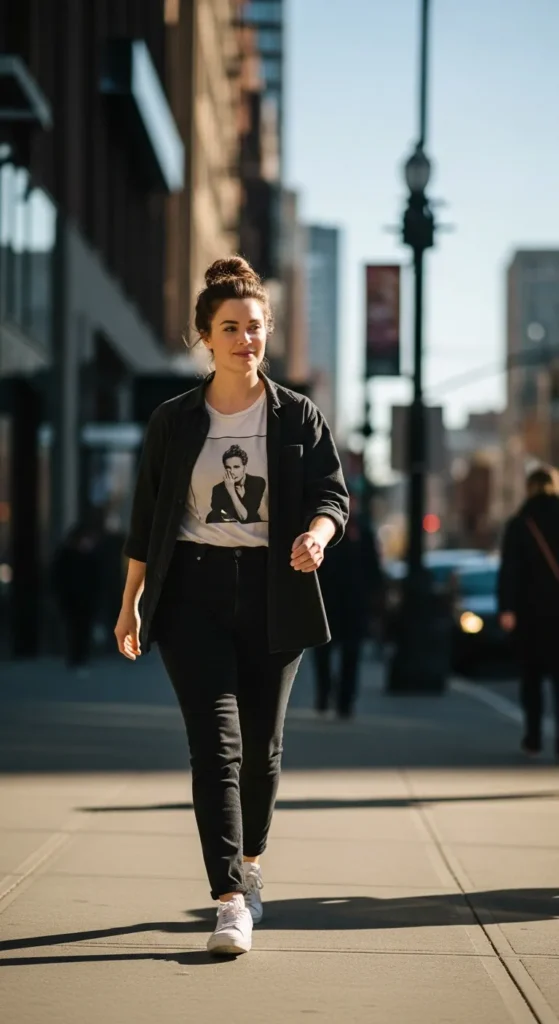 Layering a tee under a lightweight outer layer with black jeans feels practical and stylish. It’s perfect for transitional weather and busy, on-the-go days.