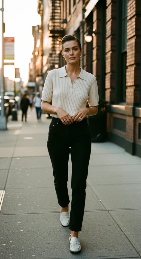 A knit polo paired with black jeans feels fresh and modern. It’s casual but intentional, offering structure through the collar while staying soft and wearable.
