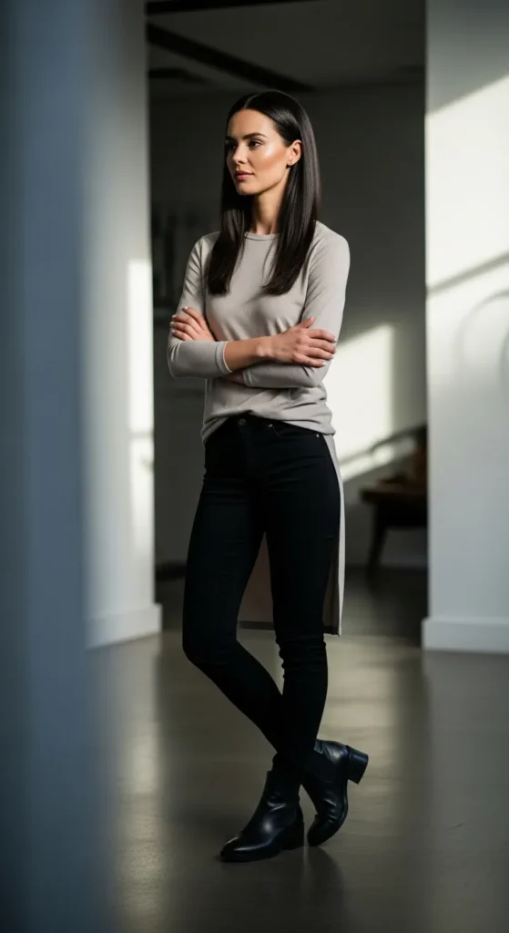 A longline top with black jeans creates a clean, elongated silhouette. It feels modern, flattering, and ideal for those days when you want simplicity with impact.