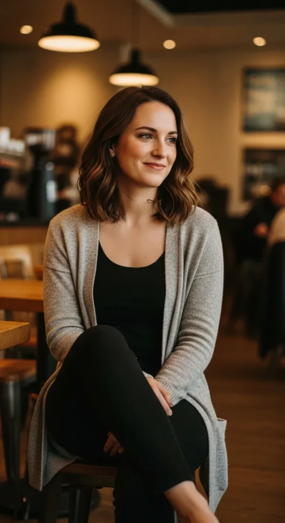 A lightweight cardigan over black jeans brings warmth and approachability. It’s the kind of outfit that feels friendly, easy, and perfect for relaxed social moments.