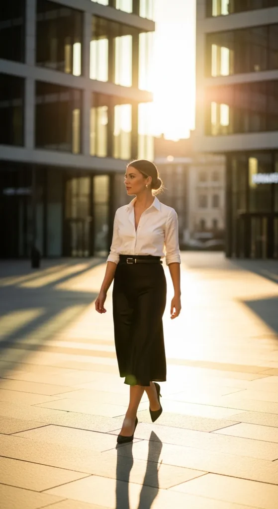 A crisp white button-down shirt tucked into a black satin skirt creates a clean, confident look that feels timeless. The sharp structure of the shirt balances the fluid movement of the skirt, making it perfect for chic daytime outings.