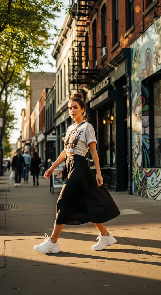 A relaxed graphic tee with a black satin skirt creates a cool mix of playful and polished. The casual graphic element makes the outfit feel youthful while the satin skirt keeps the look elevated.