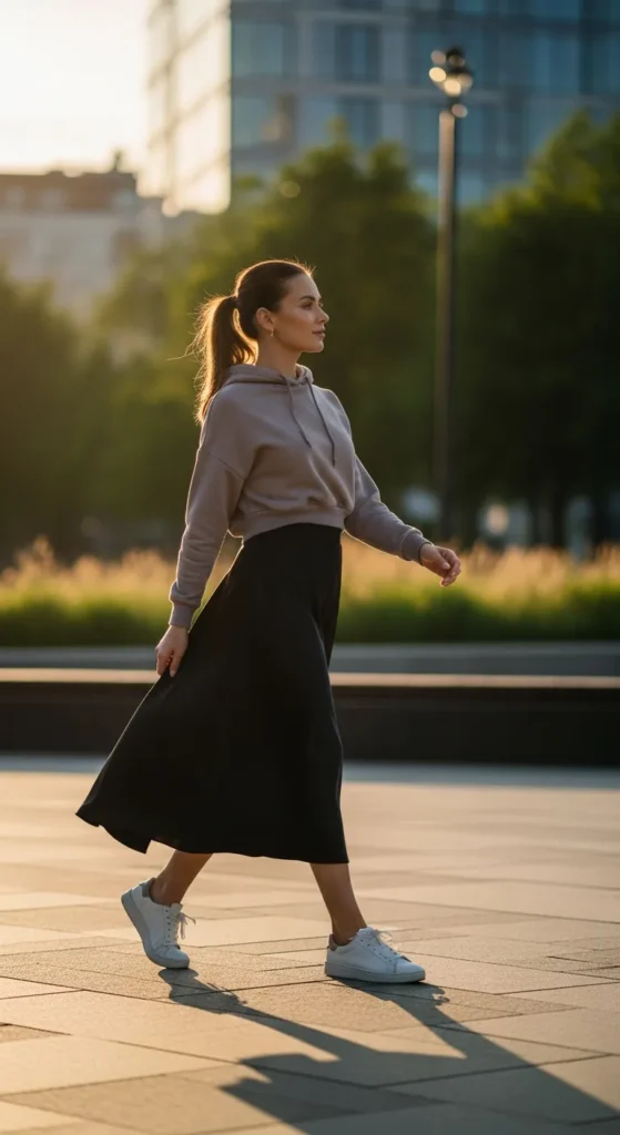 A soft hoodie paired with a satin skirt creates an unexpected mix of comfort and elegance. The relaxed hoodie softens the satin’s shine and makes the outfit perfect for casual days.