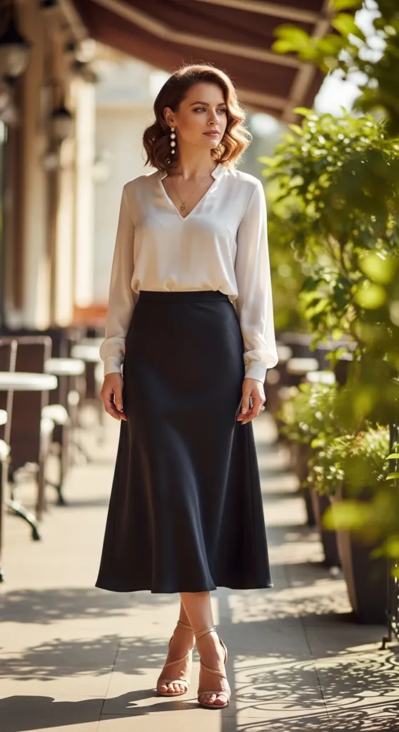 A soft lightweight blouse tucked into a black satin skirt creates a breezy, elegant outfit perfect for warm weather. The flowing fabrics move beautifully together, giving the look a graceful, feminine energy.