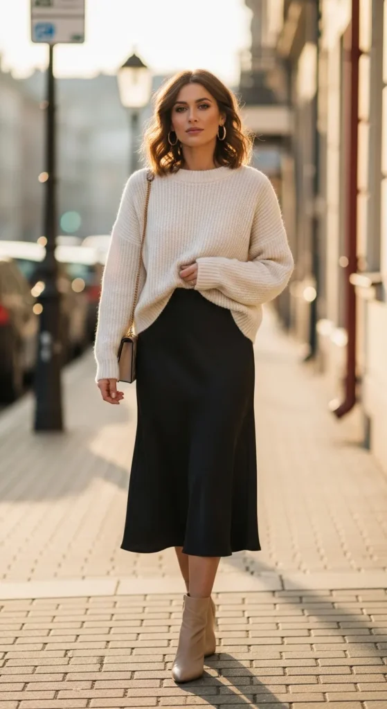 Stylist Suggestion: Add delicate gold hoop earrings and soft ankle boots. The warmth of gold jewelry complements satin beautifully, while boots anchor the outfit and keep the cozy knit from feeling too relaxed.