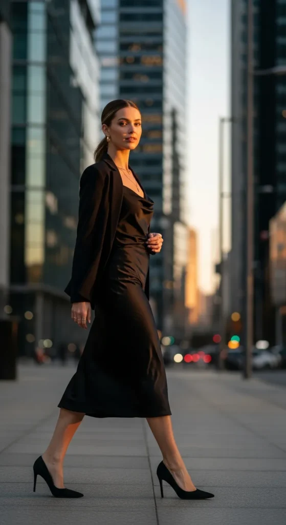 A tailored blazer over a black satin skirt creates a confident and polished outfit that feels powerful yet stylish. The structured blazer contrasts beautifully with the fluid satin fabric.