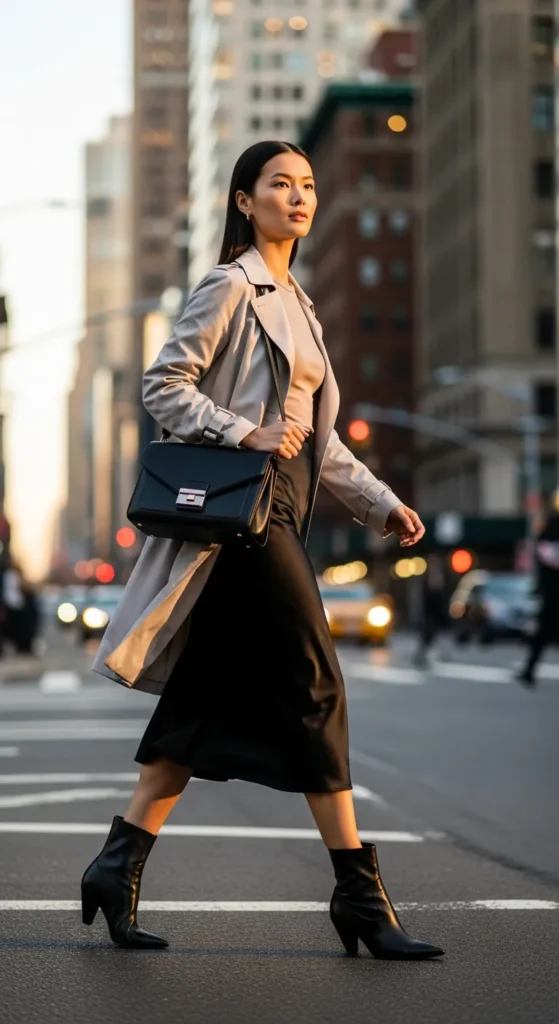 A lightweight trench coat layered over a satin skirt creates an elegant city look that feels timeless and sophisticated. The flowing coat adds movement while the satin skirt keeps the outfit polished.