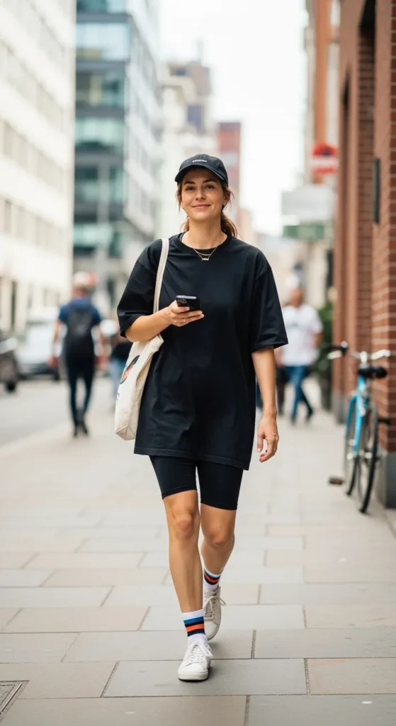 A relaxed black shirt worn over bike shorts creates a sporty, laid-back look. It’s comfortable yet stylish for casual days.