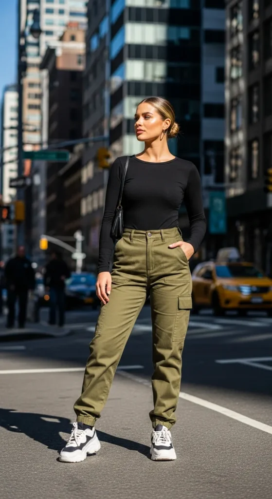 A black shirt with relaxed cargo pants gives off a slightly edgy, utilitarian feel. It’s comfortable yet cool, perfect for casual city days.