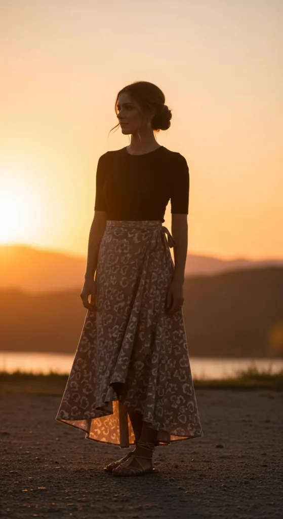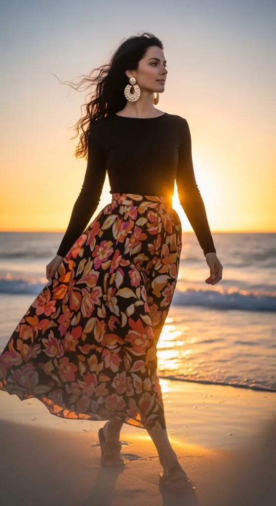 A black shirt tucked into a flowy maxi skirt creates an effortless, romantic feel. It moves beautifully and works well for warm evenings.