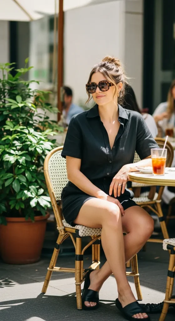 A black shirt styled with matching linen shorts creates a coordinated, relaxed set. It feels breathable and modern, perfect for warm-weather errands or coffee dates.