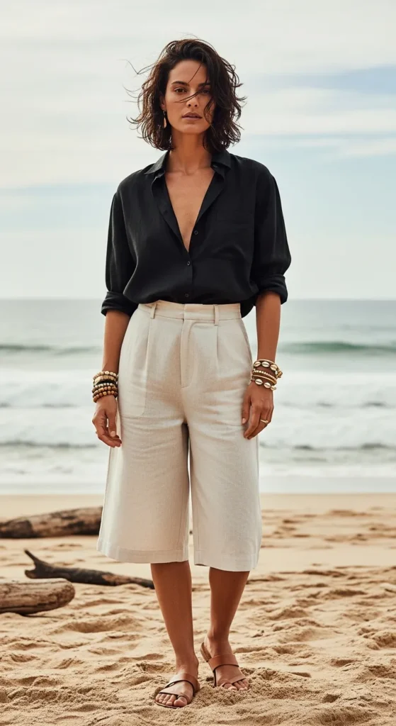 A black shirt styled with linen wide-leg shorts feels breathable and contemporary. It’s ideal for warm days when comfort matters most.