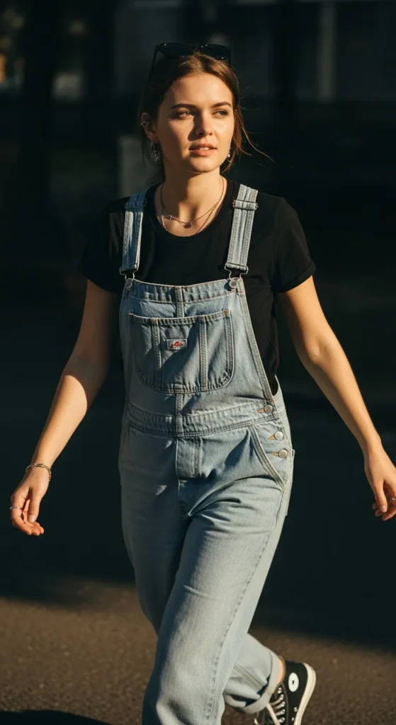 Layering a black shirt under light-wash overalls creates a youthful, playful look. It’s casual but visually interesting for everyday wear.