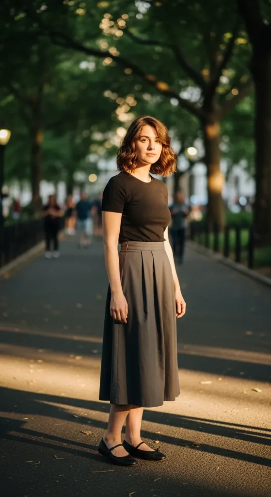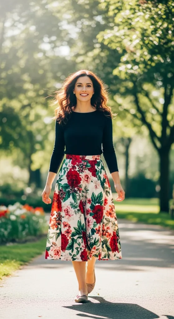 A plain black shirt lets a printed midi skirt take center stage. The mix feels playful but grounded, perfect for days when you want personality without effort.
