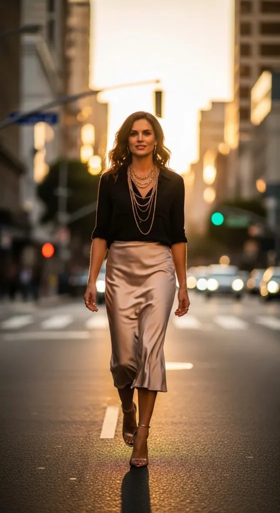 Stylist Suggestion: Choose strappy heels and delicate layered necklaces. The shine of satin pairs beautifully with subtle jewelry, enhancing the softness without overpowering the outfit.