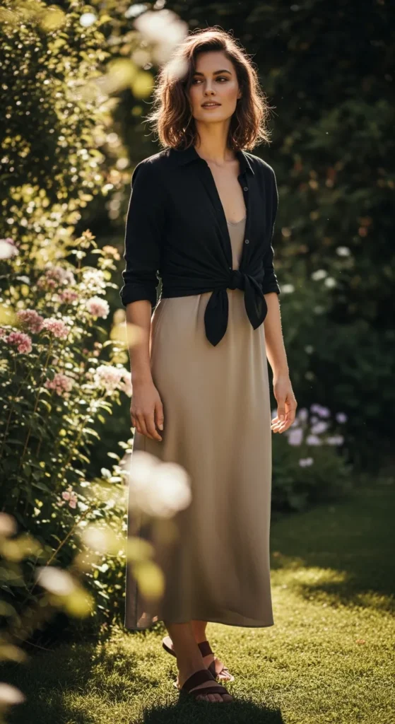 Layering a black shirt over a lightweight slip dress creates a fresh, layered summer look. It adds dimension without feeling heavy or complicated.