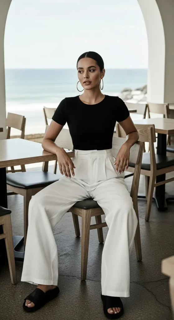 A black shirt tucked into tailored wide-leg pants feels sleek and powerful. It’s perfect for when you want a confident, polished summer outfit.