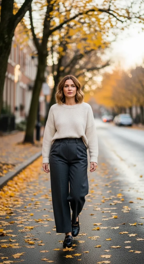 A soft oversized sweater paired with wide-leg trousers creates a cozy yet elevated silhouette. Black shoes add structure and keep the look grounded and balanced.