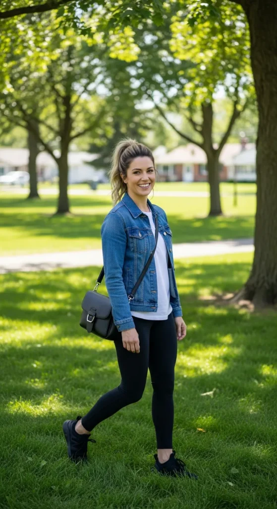 A classic denim jacket layered over a basic tee and black leggings creates a comfortable yet styled everyday look. Black sneakers tie everything together, keeping the outfit cohesive and practical.