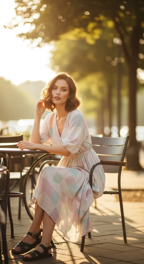 A breezy midi dress in soft tones paired with simple black sandals creates an effortlessly feminine outfit. The movement of the dress contrasts beautifully with the grounded simplicity of the shoes.