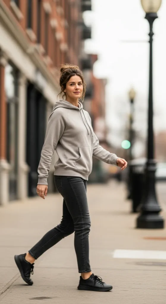 A cozy hoodie paired with slim-fit jeans offers a casual everyday look. Black sneakers keep it practical and polished enough for errands or coffee runs.