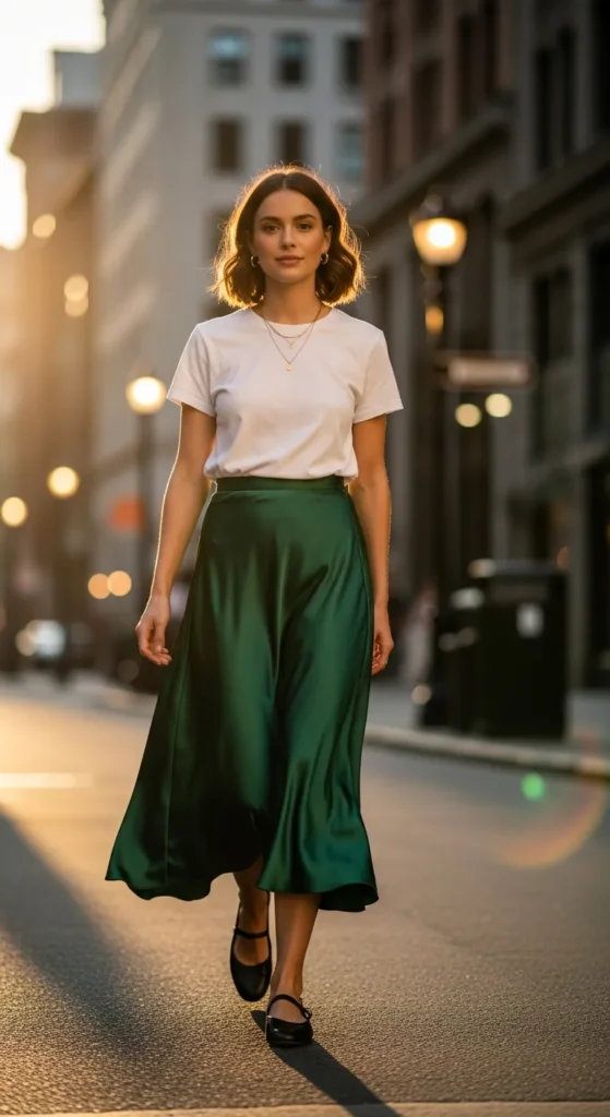 A silky satin skirt paired with a simple tee creates a beautiful contrast between casual and dressy. Black shoes balance the outfit, making it perfect for everyday styling.