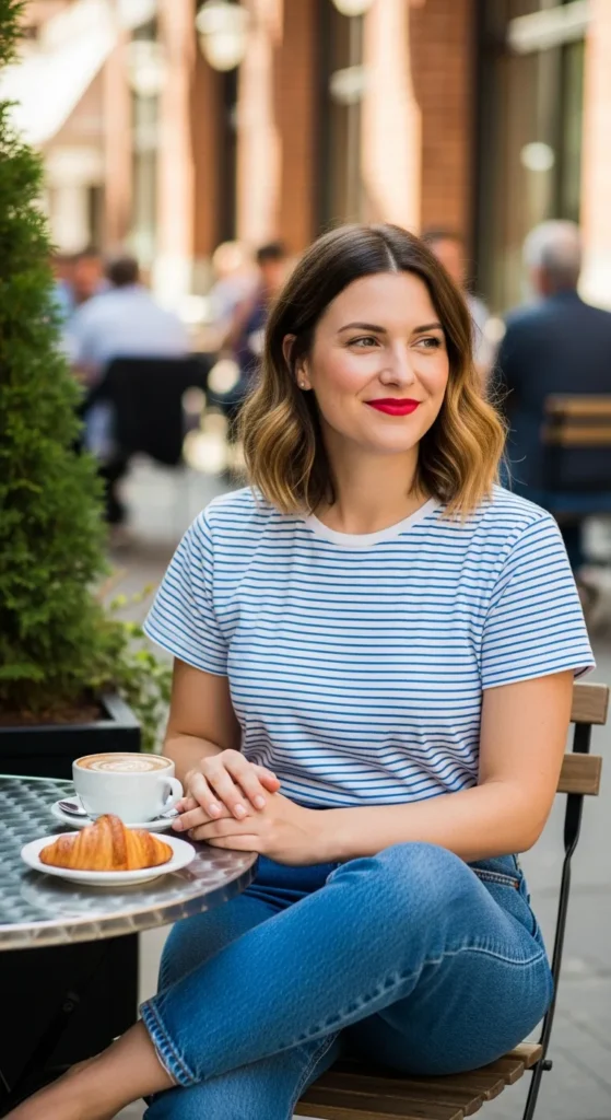 A classic striped tee tucked into high-waisted jeans feels fresh and casual. Black shoes ground the look, adding a refined touch to this everyday staple combination.