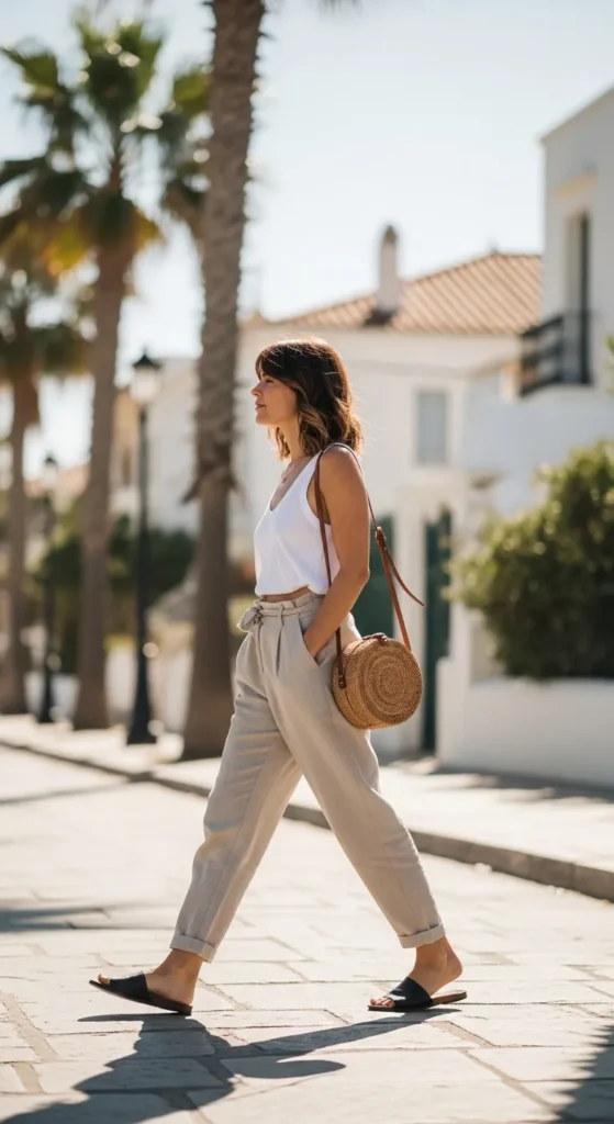 A simple tank top tucked into airy linen pants creates a breathable, relaxed outfit. Black sandals add contrast while keeping the look grounded and effortless.