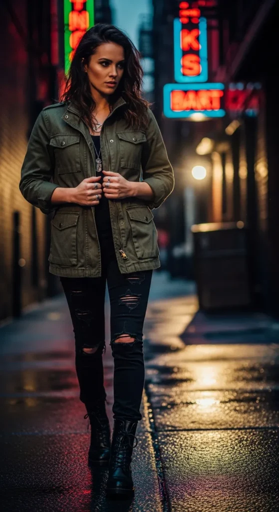 A utility jacket layered over black denim creates a slightly edgy everyday look. Black boots enhance the structured vibe while keeping the outfit cohesive.