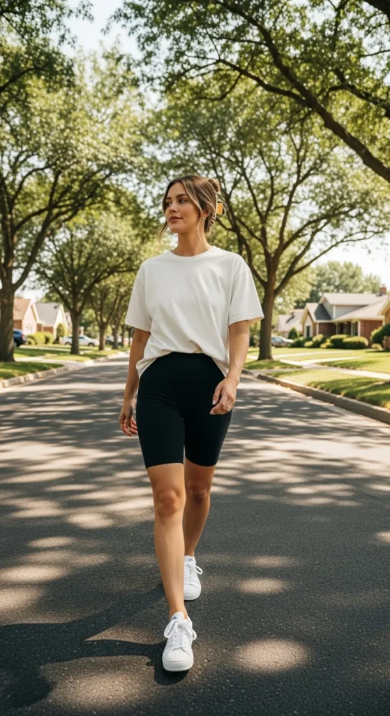 An oversized neutral tee with fitted black shorts feels effortless and youthful. It’s a go-to outfit for hot days when comfort matters but style still counts.
