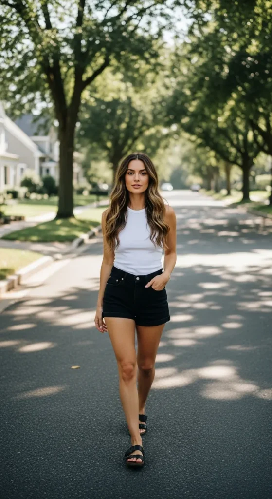 A fitted tank and black shorts with clean sneakers give subtle athletic energy. It’s comfortable, confident, and perfect for active summer days.