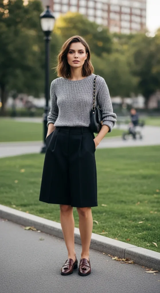 A thin summer sweater with black shorts adds a cozy texture without overheating. It’s ideal for cooler mornings or breezy evenings.