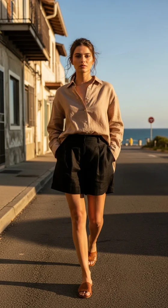 A lightweight linen shirt worn half-tucked with black shorts feels breathable and chic. This outfit gives effortless vacation energy while still working for everyday city life.