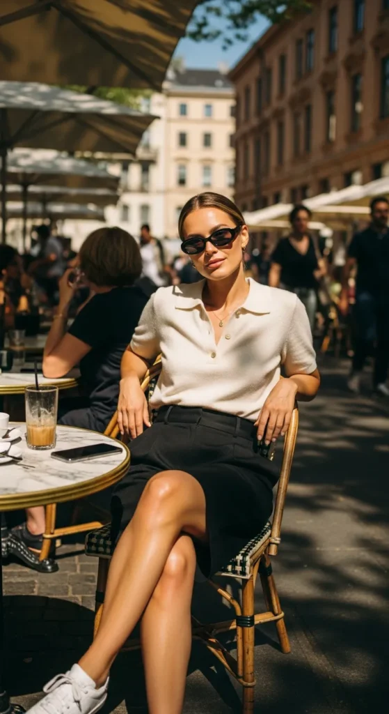A soft polo shirt styled with black shorts brings sporty elegance. It feels nostalgic yet current, perfect for casual lunches or relaxed social plans.