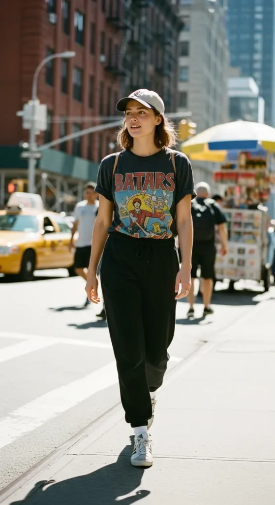Black sweatpants and a graphic tee feel expressive and personal. The outfit reflects mood and personality, creating a laid back look that still feels styled and intentional without feeling forced.