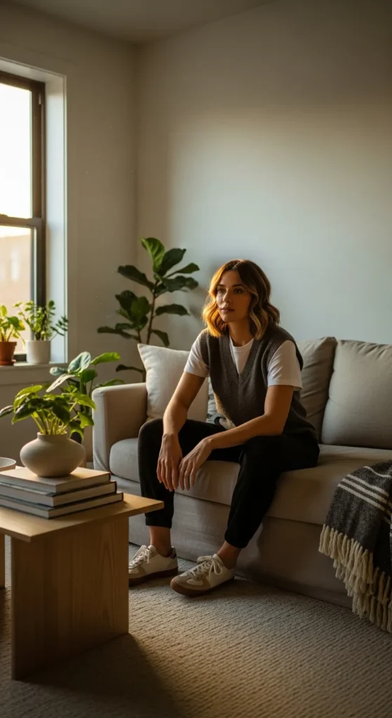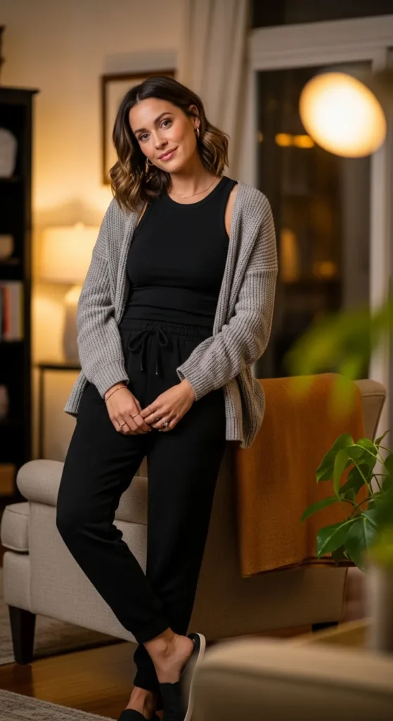 A soft cardigan layered over a tank with black sweatpants creates warmth and ease. The look feels calm, cozy, and quietly stylish, perfect for relaxed indoor days or casual outings.