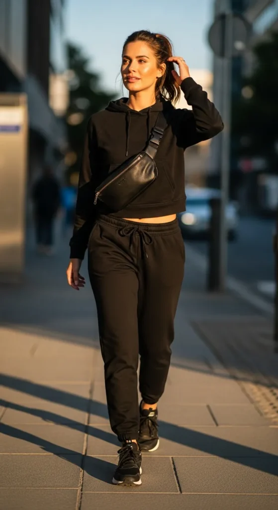 This outfit blends movement and ease, pairing black sweatpants with a cropped hoodie that shows just enough shape. It’s youthful, effortless, and perfect for days when comfort meets an active, confident mood.