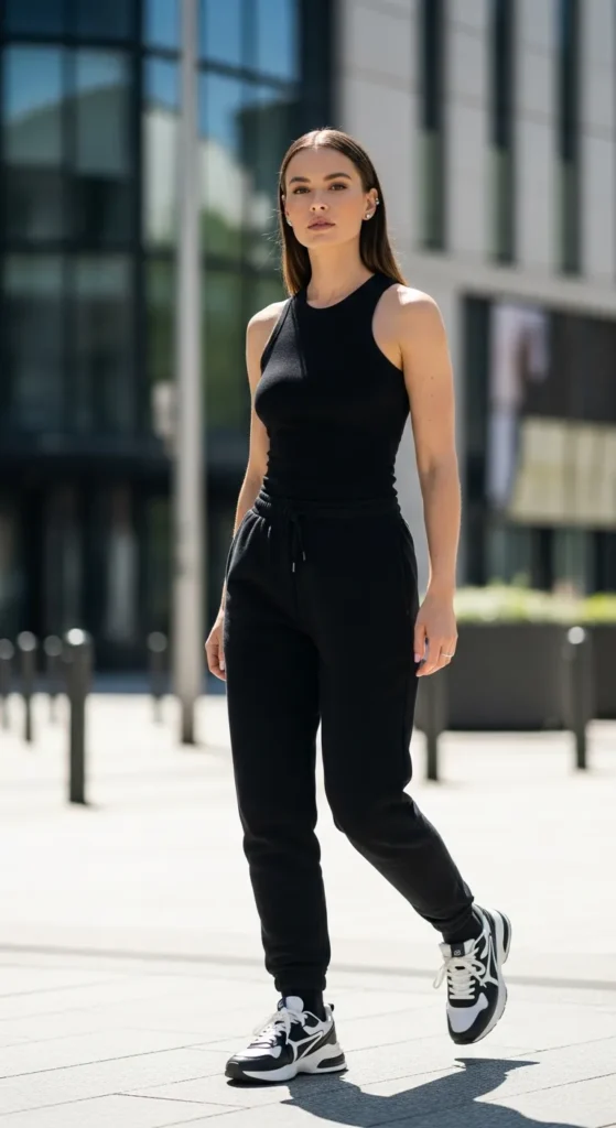 Black sweatpants with a minimal tank create a clean base that lets statement sneakers shine. The outfit feels confident, modern, and perfect for casual days when footwear does the talking.