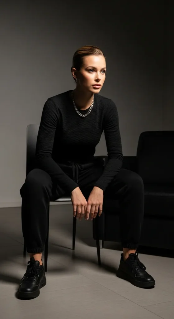 All black outfits feel powerful and effortless when textures vary. Black sweatpants paired with a different fabric top create depth, making the look feel intentional, stylish, and confidently simple.