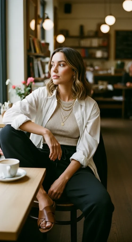 Stylist Suggestion: Choose layered necklaces and flat sandals. The jewelry adds visual interest to the minimal base, while sandals maintain the relaxed flow of the outfit without overpowering it.