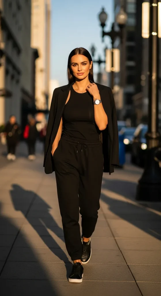 Pairing a structured blazer with black sweatpants creates a confident contrast. The outfit feels modern and relaxed, blending comfort with a touch of polish for casual meetings or city days.