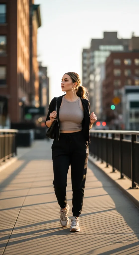 Black sweatpants paired with a fitted tank and zip up jacket create an easy, layered look. It feels practical, confident, and ready for unpredictable days without sacrificing personal style or comfort.