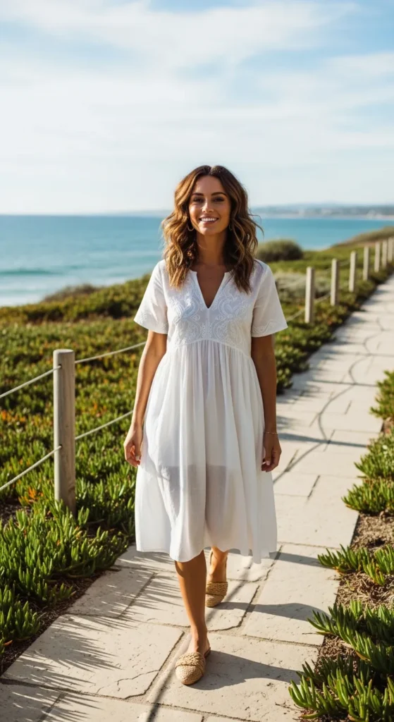 Stylist Suggestion: Pair this with tan leather flat sandals and layered gold necklaces. The natural textures balance the simplicity of white and keep the look grounded instead of feeling too bridal.