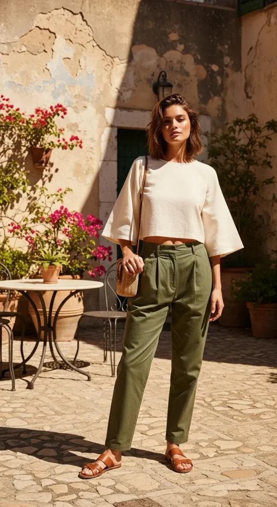 A cropped blouse balanced with relaxed cotton pants feels modern yet breathable. It’s stylish without sacrificing comfort.
